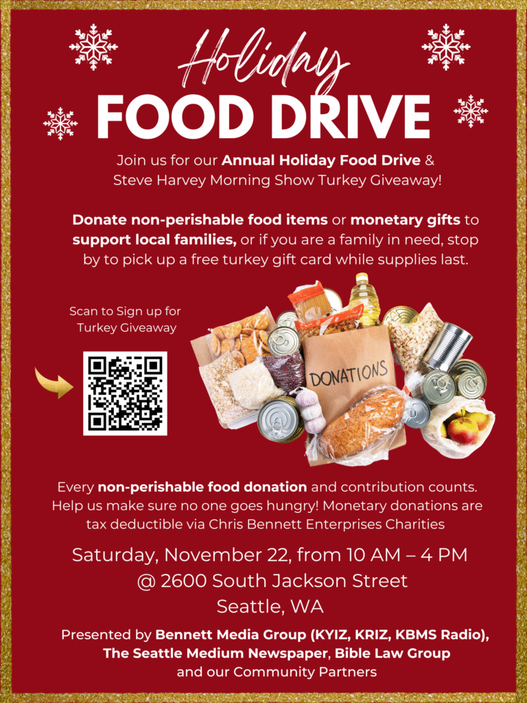 Bennett Media Group (KYIZ, KRIZ, KBMS Radio), in partnership with The Seattle Medium Newspaper, Bible Law Group, and our incredible community partners, is proud to invite you to join us for our Annual Holiday Food Drive & Steve Harvey Morning Show Turkey Giveaway. As families continue to feel the effects of rising food costs and national supply challenges, this event is an important opportunity for us to come together and show up for our community.